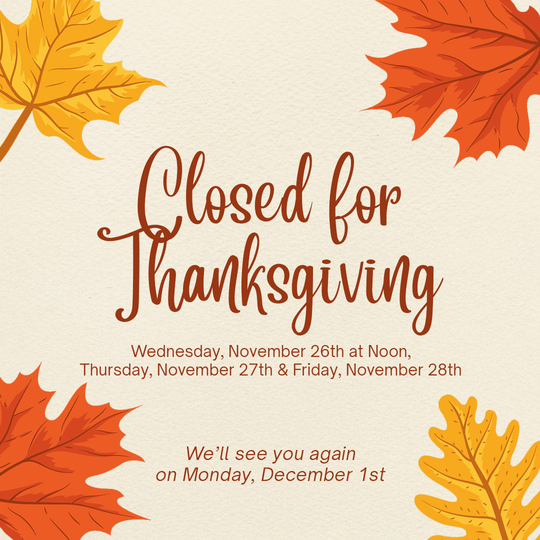 We’re taking a moment to pause and enjoy the holiday with our loved ones! Our offices will be closed this Wednesday starting at noon, and all day on Thursday, November 27th, and Friday, November 28th for Thanksgiving.
